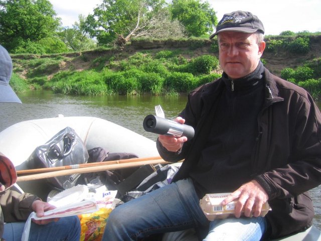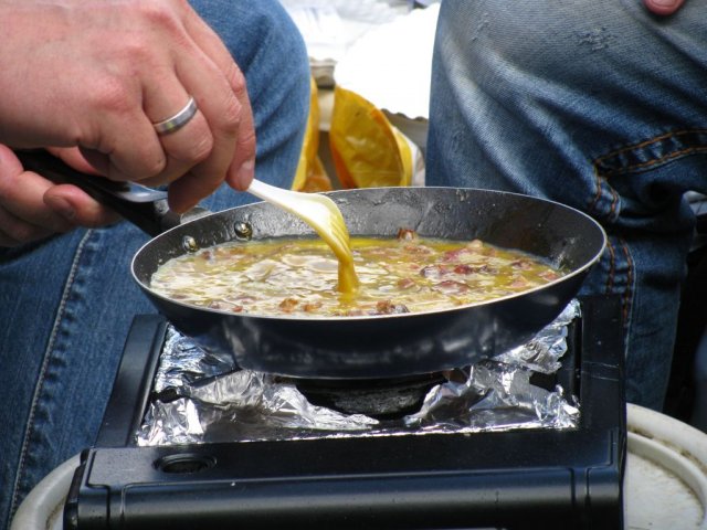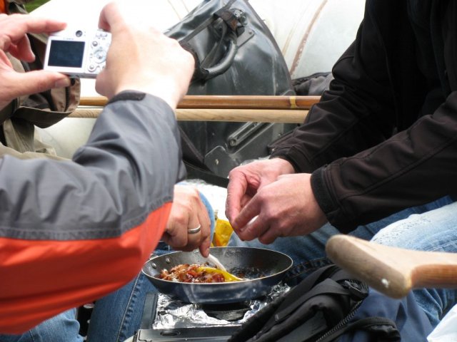 9.20 Frühstück! Es gibt Bacon mit Rührei vom Gaskocher. Eine Premiere. Tom möchte kein Frühstück weil wir in einer Teflon (Polytetrafluorethylen) Pfanne gebraten haben. Später löffelt er die Reste aus der Pfanne heraus. Leider hat der Gaskocher seinen Einsatz nicht überstanden. Da bleibt die Küche im nächsten Jahr kalt.